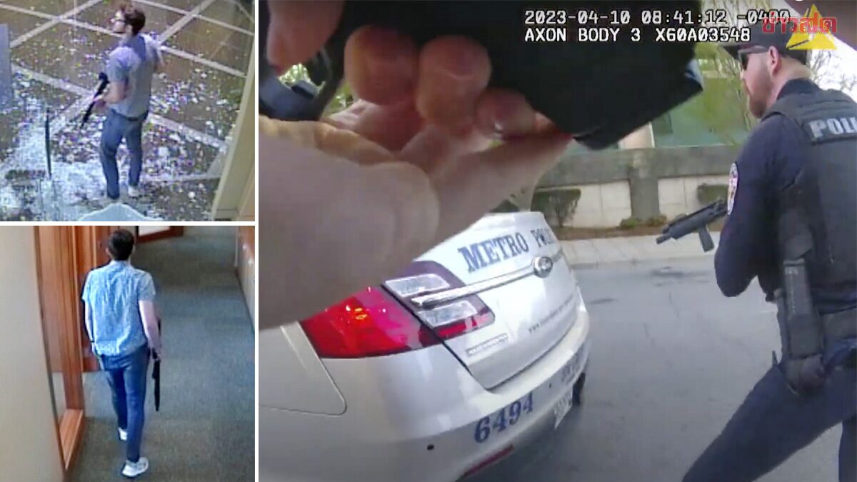 เปิดบอดี้แคม! – This surveillance video provided by the Louisville Metro Police Department shows bank employee Connor Sturgeon, 25, carrying an AR-15 assault-style rifle after opening fire at Old National Bank, in Louisville, Ky., Monday, April 10, 2023. (Courtesy of Louisville Metro Police Department via AP)