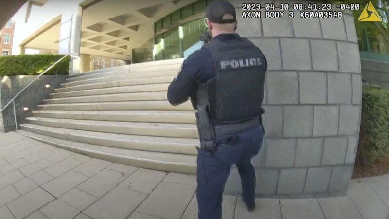 คลิปวิดีโอบอดี้แคมจากเจ้าหน้าที่คอรี กัลโลเวย์ และเจ้าหน้าที่นิโคลัส วิลต์ เผยให้เห็นเหตุการณ์ตั้งแต่ทั้งคู่เดินลงจากรถตำรวจและมุ่งหน้าไปยังอาคารที่ตั้งของธนาคารซึ่งบริเวณทางเดินด้านหน้ามีกระจกแตกกระจายเกลื่อนพื้น